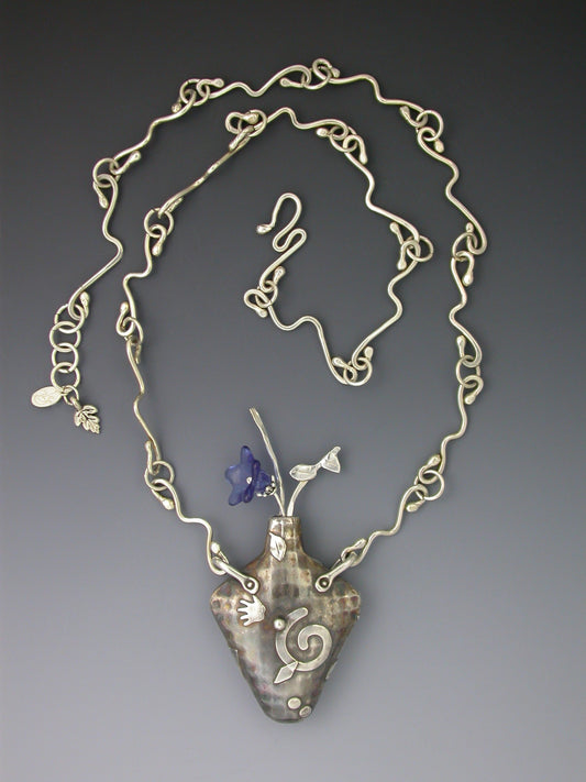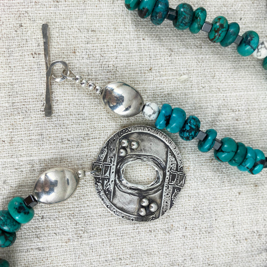 Fine Silver Tube bead on Deep Green Aventurine, Pearl and Hematite necklace