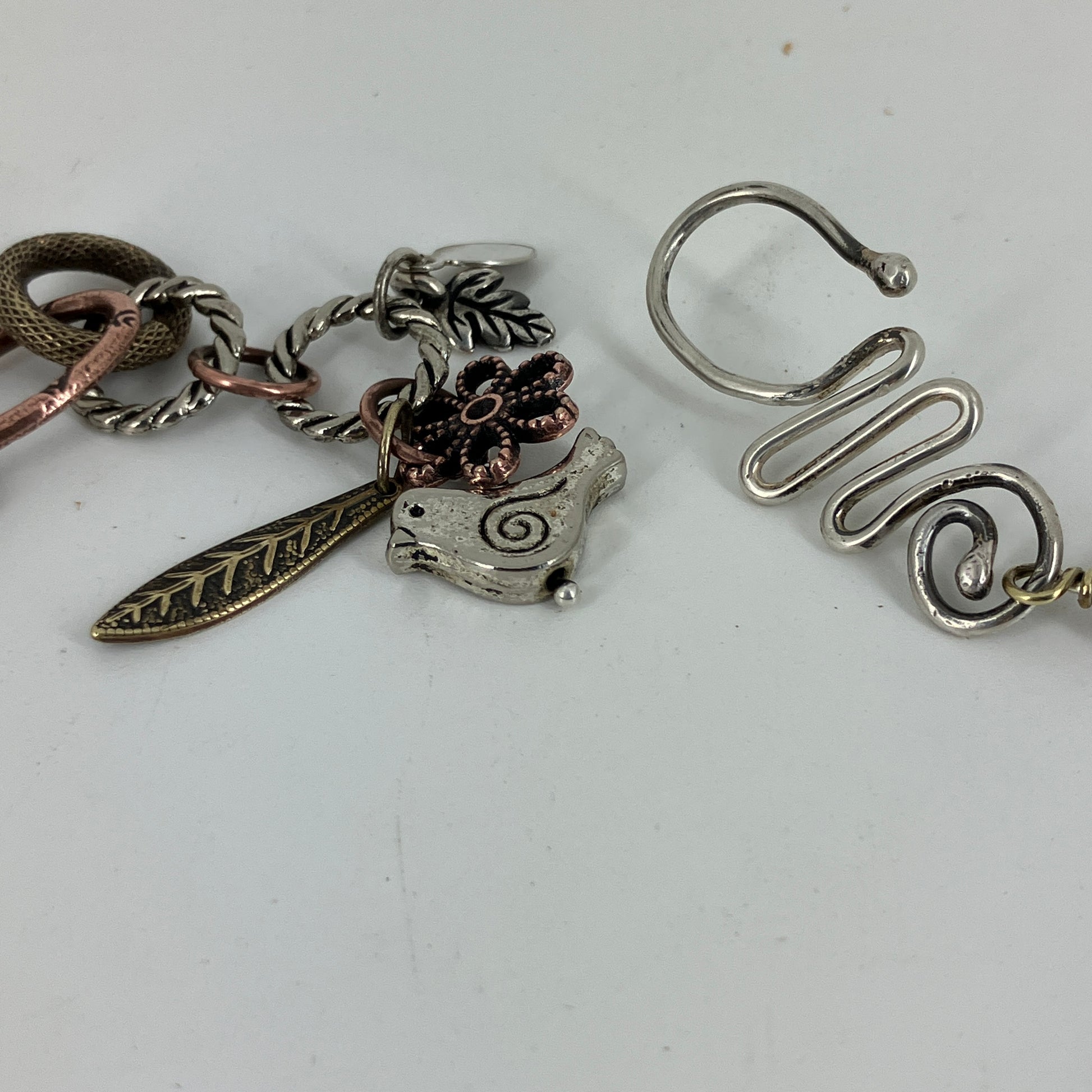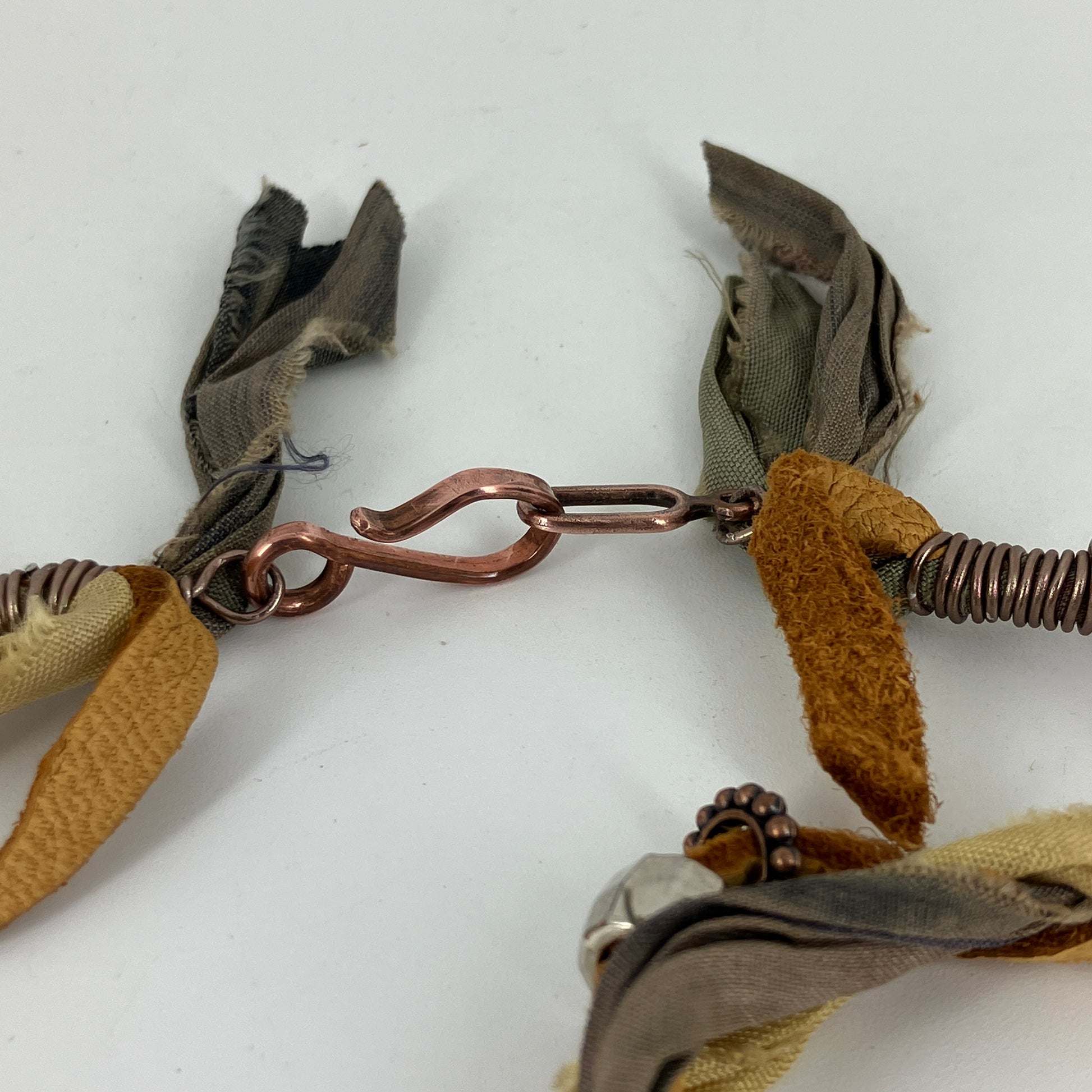 The orange necklace Is attached to a multi strand braided of sari silk and leather strewn with metal beads along its length. The clasp is a copper hook and eye tied to the fabrics with a skillful wrap of copper wire. 21" long