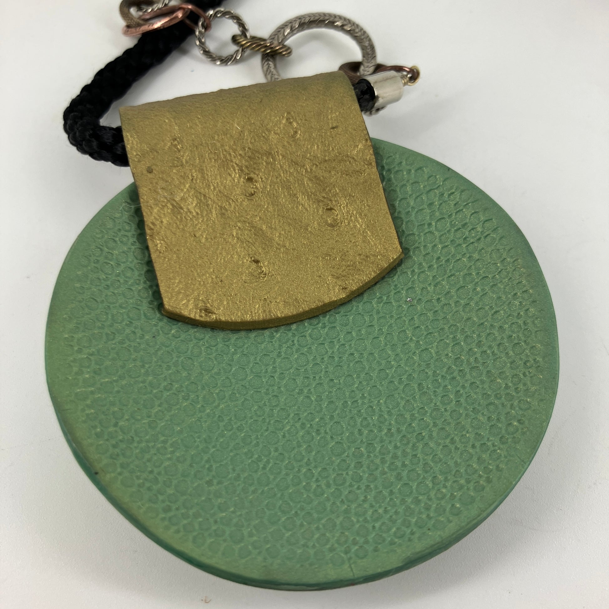 The green one has a satiny black kumihimo (braided cord) handmade and finished off with a silver plated end cap. The hook is a hand formed sterling silver wire that can be hooked into any of the rings that are attached to the opposite end of the cord. Making its 24" length adjustable to 20". Pendant 2 1/2" across. A true attention stopper.